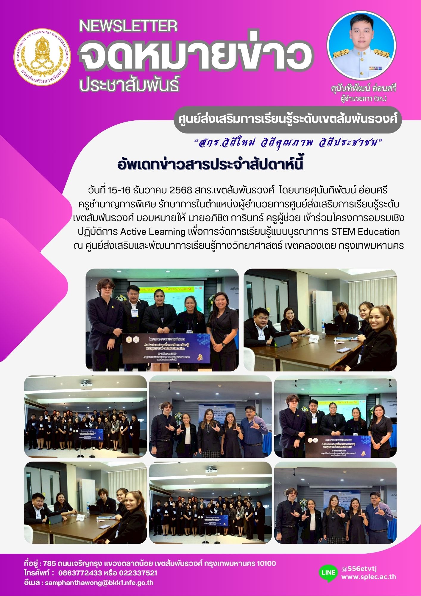 วันที่ 15-16 ธันวาคม 2568 สกร.เขตสัมพันธวงศ์ โดยนายศุนันทิพัฒน์ อ่อนศรี ครูชำนาญการพิเศษ รักษาการในตำแหน่งผู้อำนวยการศูนย์ส่งเสริมการเรียนรู้ระดับเขตสัมพันธวงศ์ มอบหมายให้ นายอภิชิต การินทร์ ครูผู้ช่วย เข้าร่วมโครงการอบรมเชิงปฏิบัติการ Active Learning เพื่อการจัดการเรียนรู้แบบบูรณาการ STEM Education ณ ศูนย์ส่งเสริมและพัฒนาการเรียนรู้ทางวิทยาศาสตร์ เขตคลองเตย กรุงเทพมหานคร