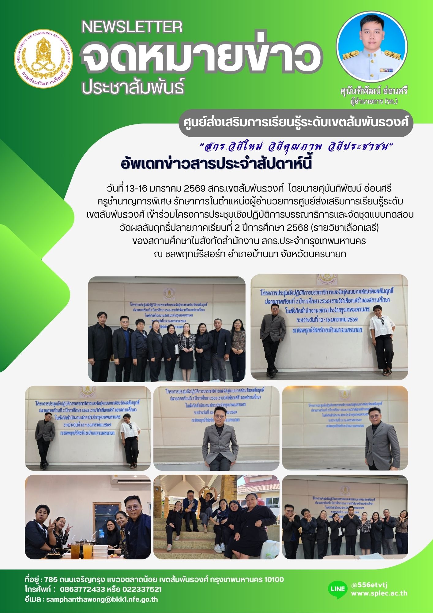 วันที่ 13-16 มกราคม 2569 สกร.เขตสัมพันธวงศ์ โดยนายศุนันทิพัฒน์ อ่อนศรี ครูชำนาญการพิเศษ รักษาการในตำแหน่งผู้อำนวยการศูนย์ส่งเสริมการเรียนรู้ระดับเขตสัมพันธวงศ์ เข้าร่วมโครงการประชุมเชิงปฏิบัติการบรรณาธิการและจัดชุดแบบทดสอบวัดผลสัมฤทธิ์ปลายภาคเรียนที่ 2 ปีการศึกษา 2568 (รายวิชาเลือกเสรี) ของสถานศึกษาในสังกัดสำนักงาน สกร.ประจำกรุงเทพมหานคร ณ ชลพฤกษ์รีสอร์ท อำเภอบ้านนา จังหวัดนครนายก