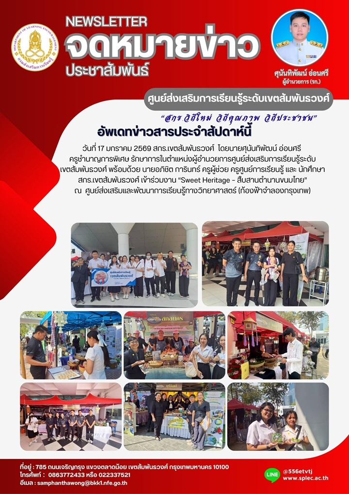 วันที่ 17 มกราคม 2569 สกร.เขตสัมพันธวงศ์ โดยนายศุนันทิพัฒน์ อ่อนศรี ครูชำนาญการพิเศษ รักษาการในตำแหน่งผู้อำนวยการศูนย์ส่งเสริมการเรียนรู้ระดับเขตสัมพันธวงศ์ พร้อมด้วย นายอภิชิต การินทร์ ครูผู้ช่วย ครูศูนย์การเรียนรู้ และ นักศึกษา สกร.เขตสัมพันธวงศ์ เข้าร่วมงาน “Sweet Heritage – สืบสานตำนานขนมไทย” ณ ศูนย์ส่งเสริมและพัฒนาการเรียนรู้ทางวิทยาศาสตร์ (ท้องฟ้าจำลองกรุงเทพ)