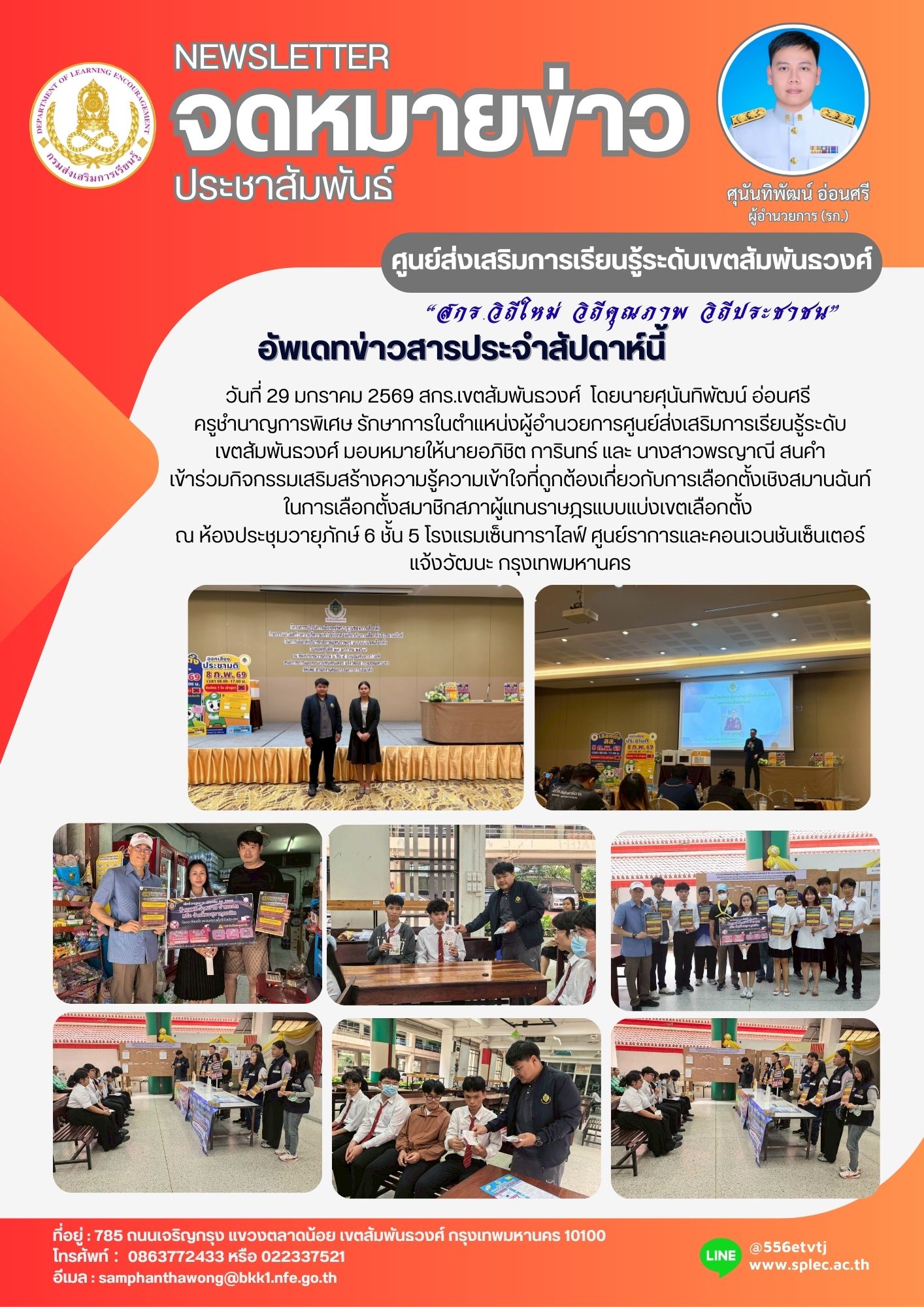 วันที่ 29 มกราคม 2569 สกร.เขตสัมพันธวงศ์ โดยนายศุนันทิพัฒน์ อ่อนศรี ครูชำนาญการพิเศษ รักษาการในตำแหน่งผู้อำนวยการศูนย์ส่งเสริมการเรียนรู้ระดับเขตสัมพันธวงศ์ มอบหมายให้นายอภิชิต การินทร์ และ นางสาวพรญาณี สนคำ เข้าร่วมกิจกรรมเสริมสร้างความรู้ความเข้าใจที่ถูกต้องเกีี่ยวกับการเลือกตั้งเชิงสมานฉันท์ในการเลือกตั้งสมาชิิกสภาผู้แทนราษฎรแบบแบ่งเขตเลือกตั้ง ณ ห้องประชุมวายุภักษ์ 6 ชั้น 5 โรงแรมเซ็นทาราไลฟ์ ศูนย์ราการและคอนเวนชันเซ็นเตอร์ แจ้งวัฒนะ กรุงเทพมหานคร