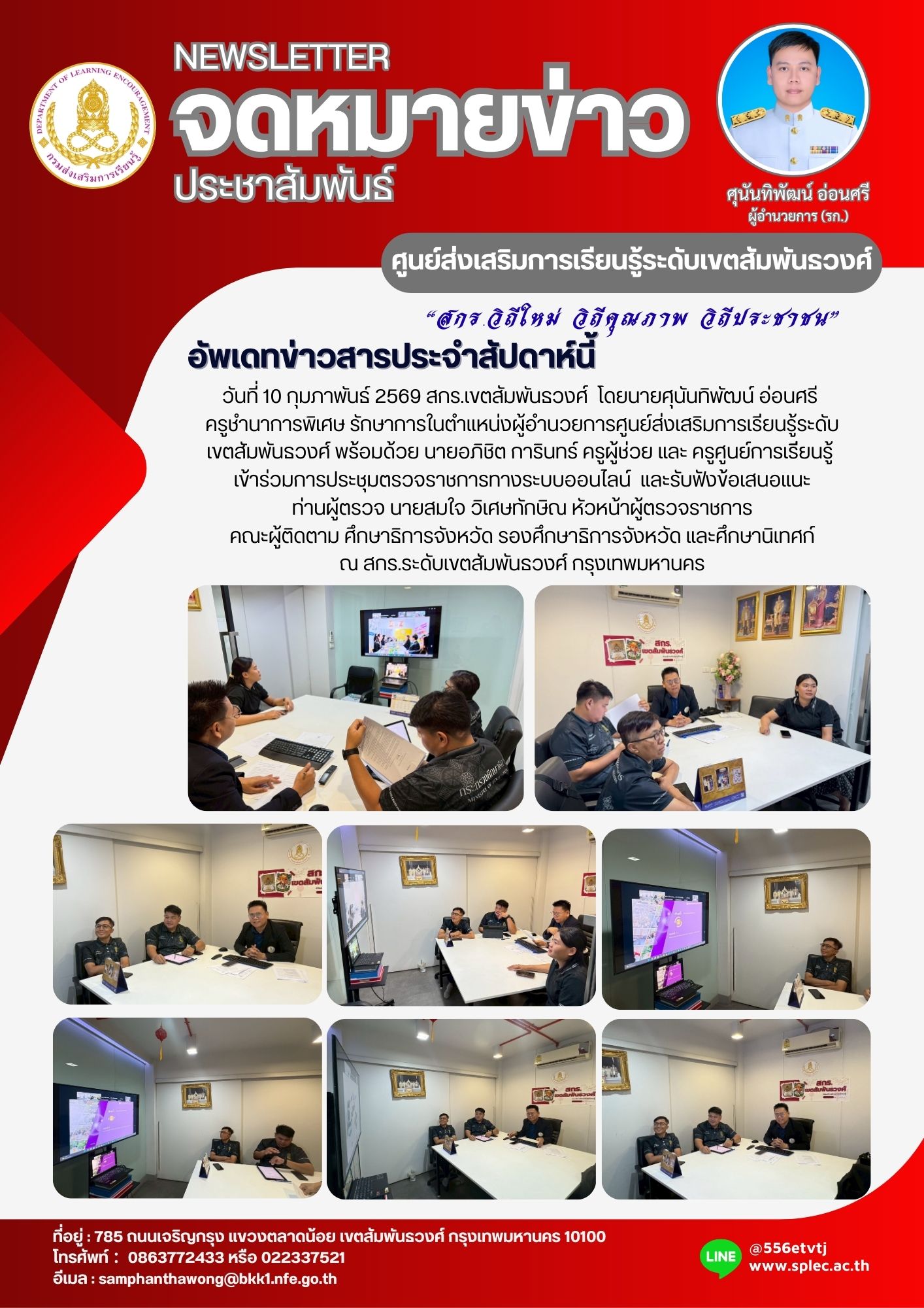วันที่ 10 กุมภาพันธ์ 2569 สกร.เขตสัมพันธวงศ์ โดยนายศุนันทิพัฒน์ อ่อนศรี ครูชำนาการพิเศษ รักษาการในตำแหน่งผู้อำนวยการศูนย์ส่งเสริมการเรียนรู้ระดับเขตสัมพันธวงศ์ พร้อมด้วย นายอภิชิต การินทร์ ครูผู้ช่วย และ ครูศูนย์การเรีียนรู้ เข้าร่วมการประชุมตรวจราชการทางระบบออนไลน์ และรับฟังข้อเสนอแนะท่านผู้ตรวจ นายสมใจ วิเศษทักษิณ หัวหน้าผู้ตรวจราชการ คณะผู้ติดตาม ศึกษาธิการจังหวัด รองศึกษาธิการจังหวัด และศึกษานิเทศก์ ณ สกร.ระดับเขตสัมพันธวงศ์ กรุงเทพมหานคร