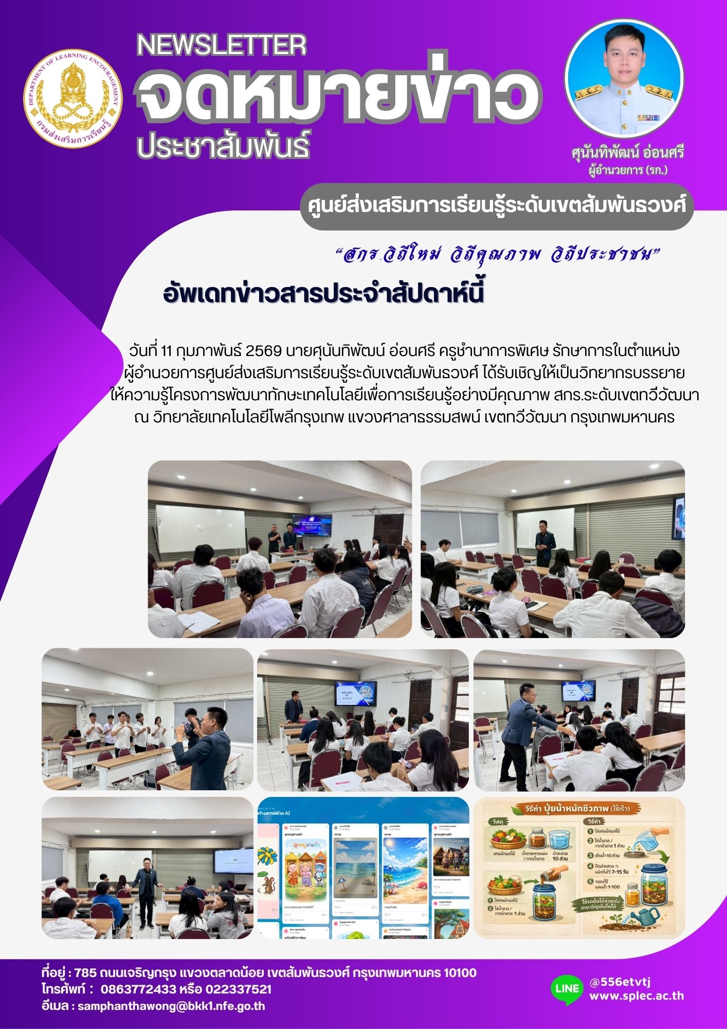 วันที่ 11 กุมภาพันธ์ 2569 นายศุนันทิพัฒน์ อ่อนศรี ครูชำนาการพิเศษ รักษาการในตำแหน่ง ผู้อำนวยการศูนย์ส่งเสริมการเรียนรู้ระดับเขตสัมพันธวงศ์ ได้รับเชิญให้เป็นวิทยากรบรรยายให้ความรู้โครงการพัฒนาทักษะเทคโนโลยีเพื่อการเรียนรู้อย่างมีคุณภาพ สกร.ระดับเขตทวีีวัฒนา ณ วิทยาลัยเทคโนโลยีโพลีกรุงเทพ แขวงศาลาธรรมสพน์ เขตทวีวัฒนา กรุงเทพมหานคร