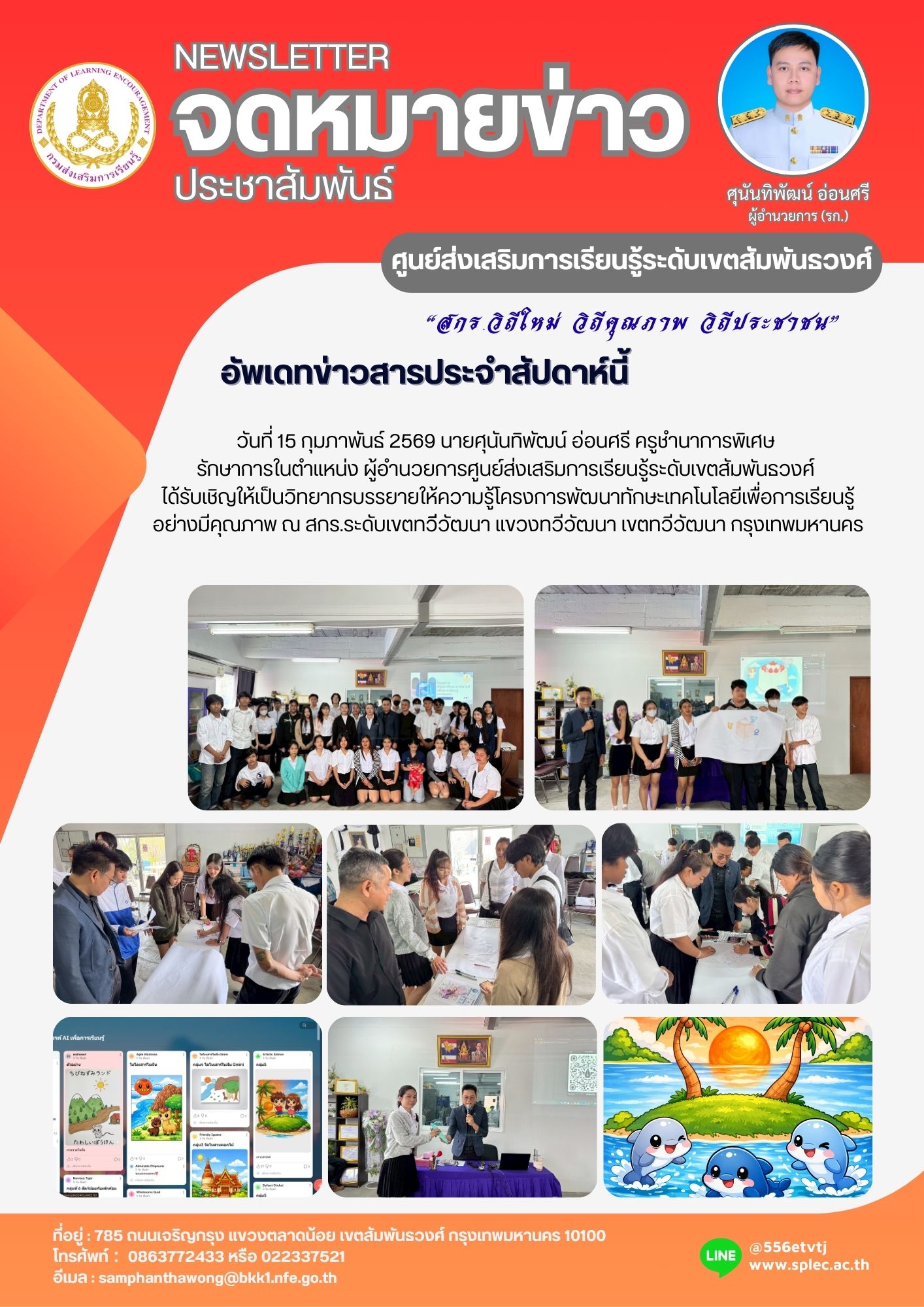 วันที่ 15 กุมภาพันธ์ 2569 นายศุนันทิพัฒน์ อ่อนศรี ครูชำนาการพิเศษ รักษาการในตำแหน่ง ผู้อำนวยการศูนย์ส่งเสริมการเรียนรู้ระดับเขตสัมพันธวงศ์ ได้รับเชิญให้เป็นวิทยากรบรรยายให้ความรู้โครงการพัฒนาทักษะเทคโนโลยีเพื่อการเรียนรู้อย่างมีคุณภาพ ณ สกร.ระดับเขตทวีีวัฒนา แขวงทวีวัฒนา เขตทวีวัฒนา กรุงเทพมหานคร