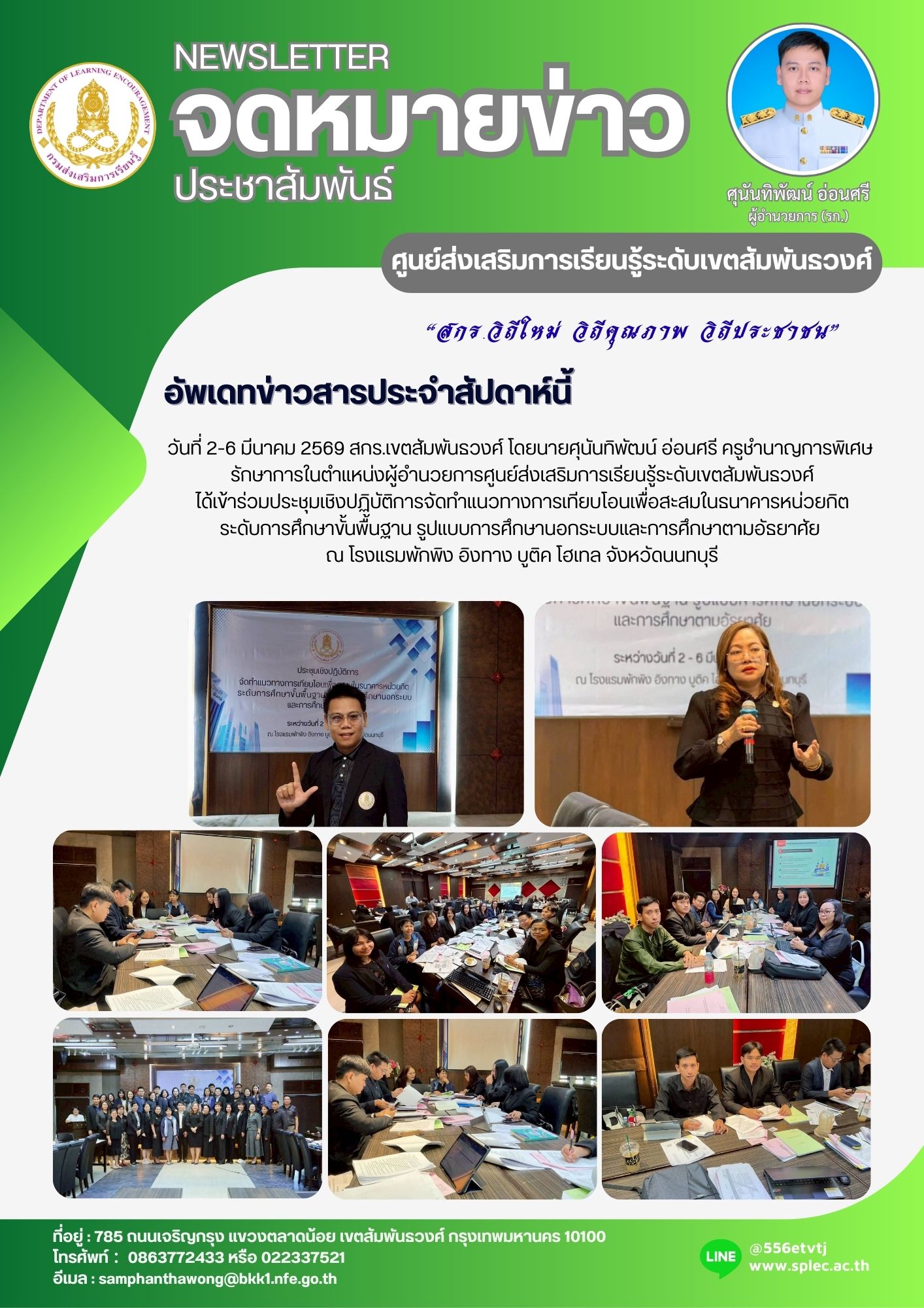 วันที่ 2-6 มีนาคม 2569 สกร.เขตสัมพันธวงศ์ โดยนายศุนันทิพัฒน์ อ่อนศรี ครูชำนาญการพิเศษ รักษาการในตำแหน่งผู้อำนวยการศูนย์ส่งเสริมการเรียนรู้ระดับเขตสัมพันธวงศ์ ได้เข้าร่วมประชุมเชิงปฏิบัติการจัดทำแนวทางการเทียบโอนเพื่อสะสมในธนาคารหน่วยกิตระดับการศึกษาขั้นพื้นฐาน รูปแบบการศึกษานอกระบบและการศึกษาตามอัธยาศัย ณ โรงแรมพักพิง อิงทาง บูติค โฮเทล จังหวัดนนทบุรี
