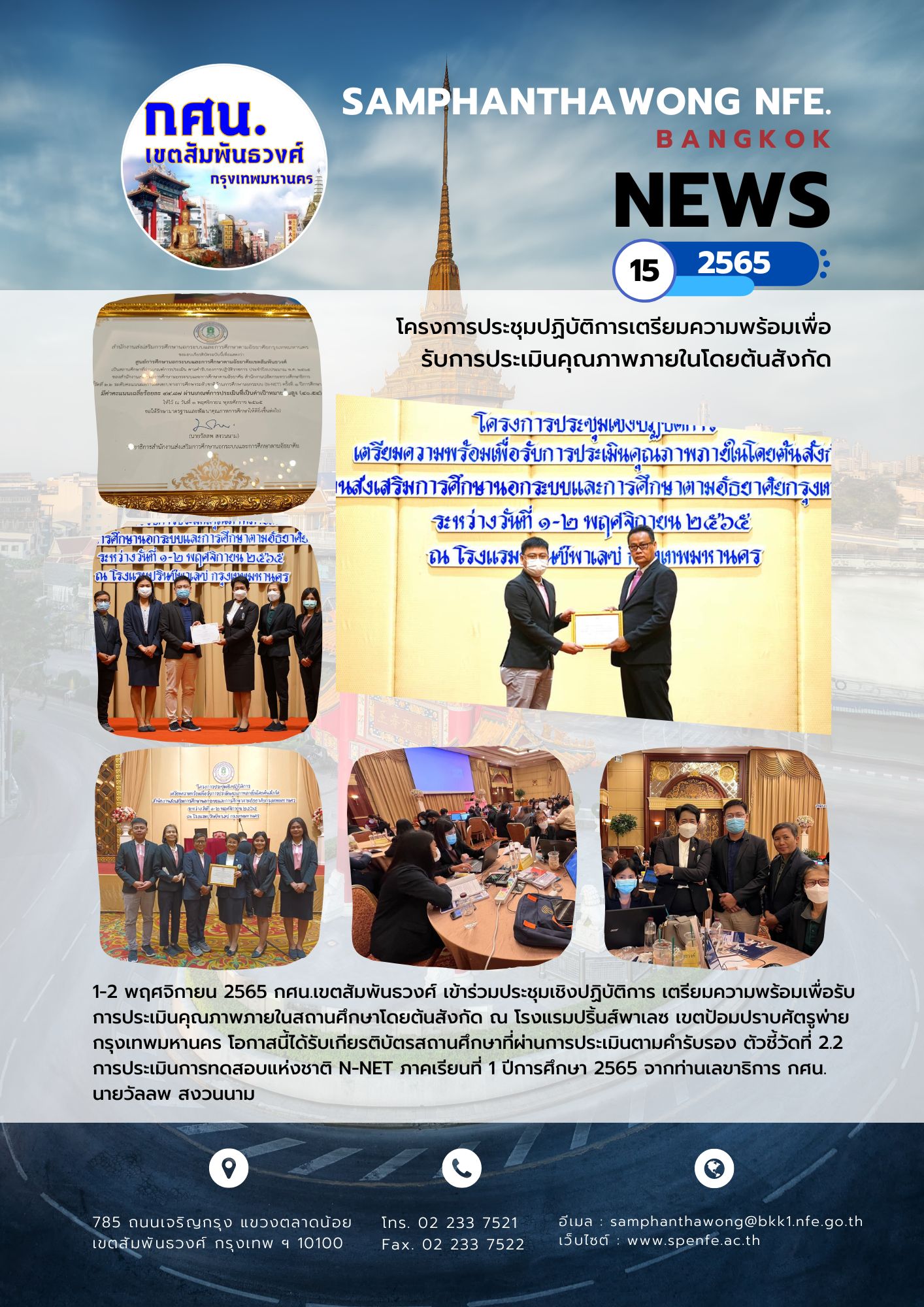 1-2 พฤศจิกายน 2565 กศน.เขตสัมพันธวงศ์ กรุงเทพฯ เข้าร่วมประชุมเชิงปฏิบัติการ เตรียมความพร้อมเพื่อรับการประเมินคุณภาพภายในสถานศึกษาโดยต้นสังกัด ณ โรงแรมปริ้นส์พาเลซ เขตป้อมปราบศัตรูพ่าย กรุงเทพมหานคร โอกาสนี้ได้รับเกียรติบัตรสถานศึกษาที่ผ่านการประเมินตามคำรับรอง ตัวชี้วัดที่ 2.2 การประเมินการทดสอบแห่งชาติ N-NET ภาคเรียนที่ 1 ปีการศึกษา 2565 จากท่านเลขาธิการ กศน. นายวัลลพ สงวนนาม