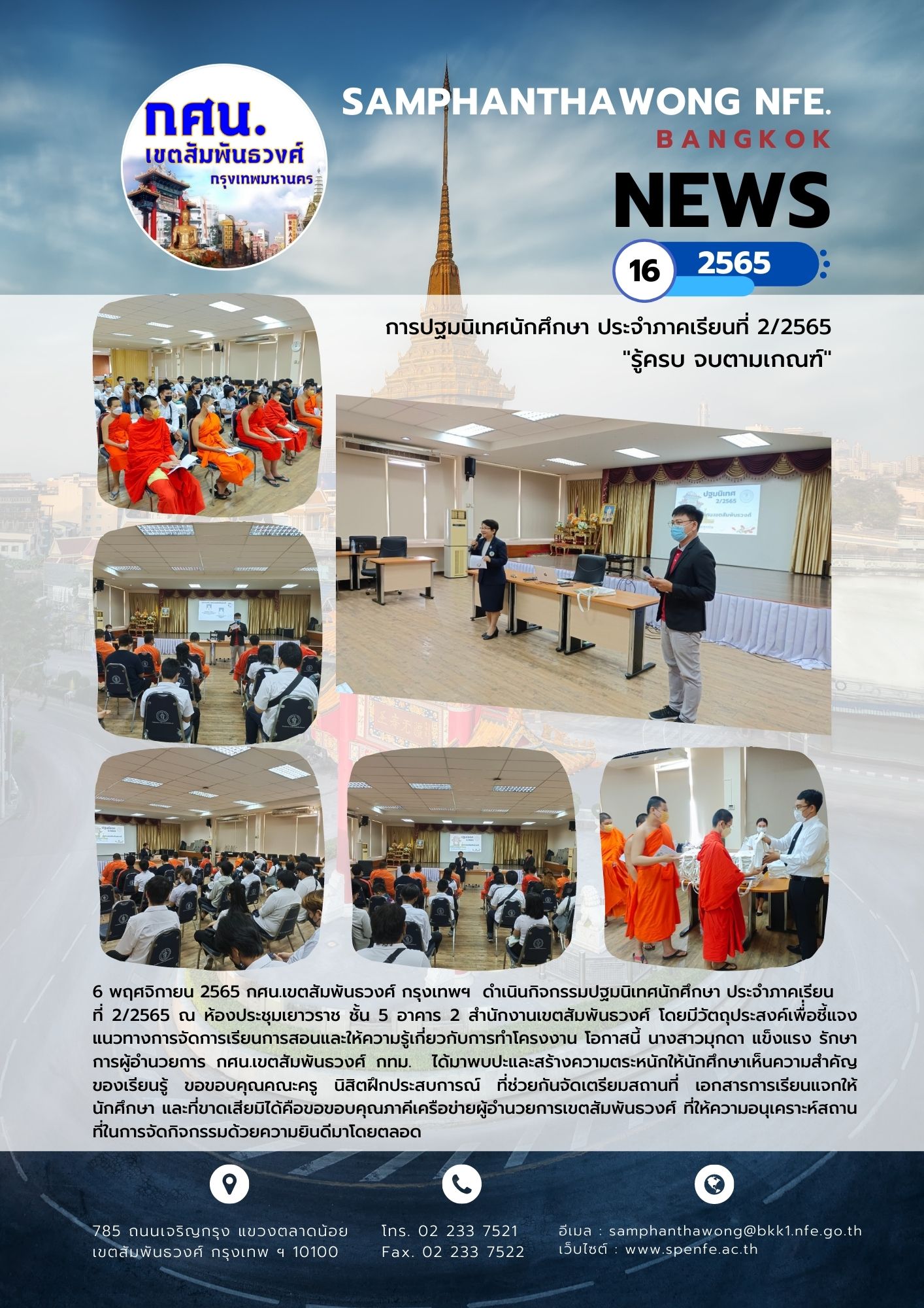 6 พฤศจิกายน 2565 กศน.เขตสัมพันธวงศ์ กรุงเทพฯ ดำเนินกิจกรรมปฐมนิเทศนักศึกษา ประจำภาคเรียนที่ 2/2565 ณ ห้องประชุมเยาวราช ชั้น 5 อาคาร 2 สำนักงานเขตสัมพันธวงศ์ โดยมีวัตถุประสงค์เพื่่อชี้แนวทางการจัดการเรียนการสอน และให้ความรู้เกี่ยวกับการทำโครงงาน โอกาสนี้ นางสาวมุกดา แข็งแรง รักษาการผู้อำนวยการ กศน.เขตสัมพันธวงศ์ กทม. ได้มาพบปะและสร้างความตระหนักให้นักศึกษาเห็นความสำคัญของเรียนรู้ ขอขอบคุณคณะครู นิสิตฝึกประสบการณ์ ที่ช่วยกันจัดเตรียมสถานที่ เอกสารการเรียนแจกให้นักศึกษา และที่ขาดเสียมิได้คือขอขอบคุณภาคีเครือข่ายผู้อำนวยการเขตสัมพันธวงศ์ ที่ให้ความอนุเคราะห์สถานที่ในการจัดกิจกรรมด้วยความยินดีมาโดยตลอด
