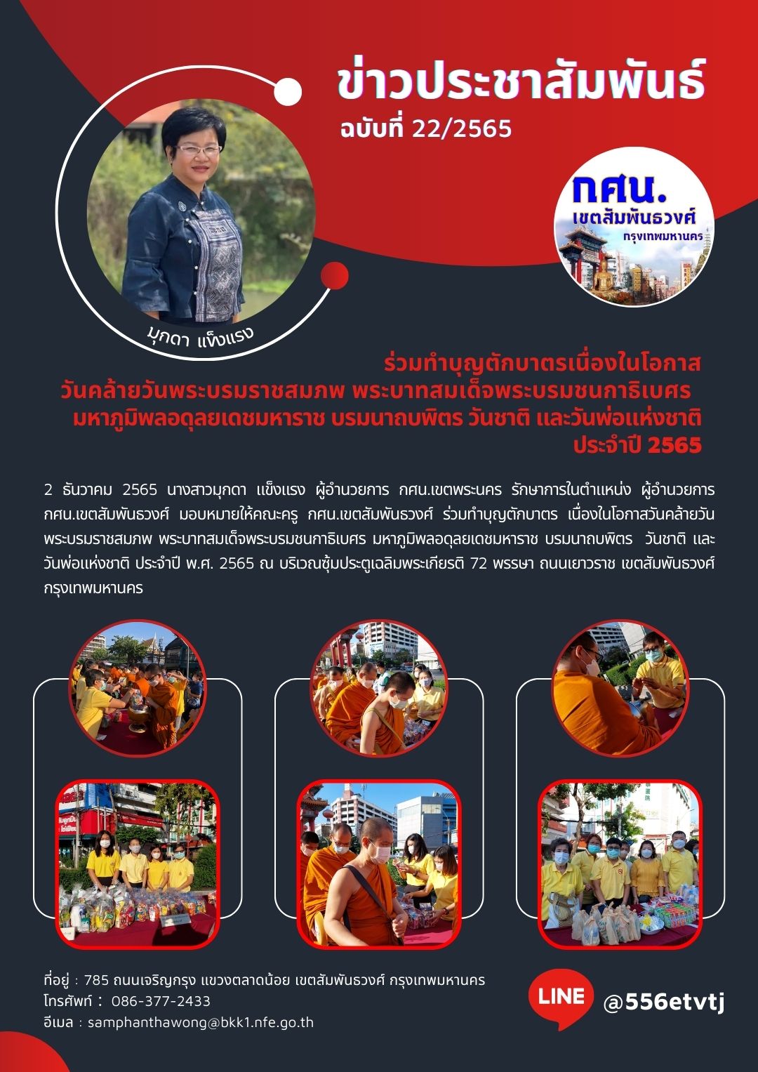2 ธันวาคม 2565 นางสาวมุกดา แข็งแรง ผู้อำนวยการ กศน.เขตพระนคร รักษาการในตำแหน่ง ผู้อำนวยการ กศน.เขตสัมพันธวงศ์ มอบหมายให้คณะครู กศน.เขตสัมพันธวงศ์ ร่วมทำบุญตักบาตร เนื่องในโอกาสวันคล้ายวัน พระบรมราชสมภพ พระบาทสมเด็จพระบรมชนกาธิเบศร มหาภูมิพลอดุลยเดชมหาราช บรมนาถบพิตร วันชาติ และวันพ่อแห่งชาติ ประจำปี พ.ศ. 2565 ณ บริเวณซุ้มประตูเฉลิมพระเกียรติ 72 พรรษา ถนนเยาวราช เขตสัมพันธวงศ์ กรุงเทพมหานคร