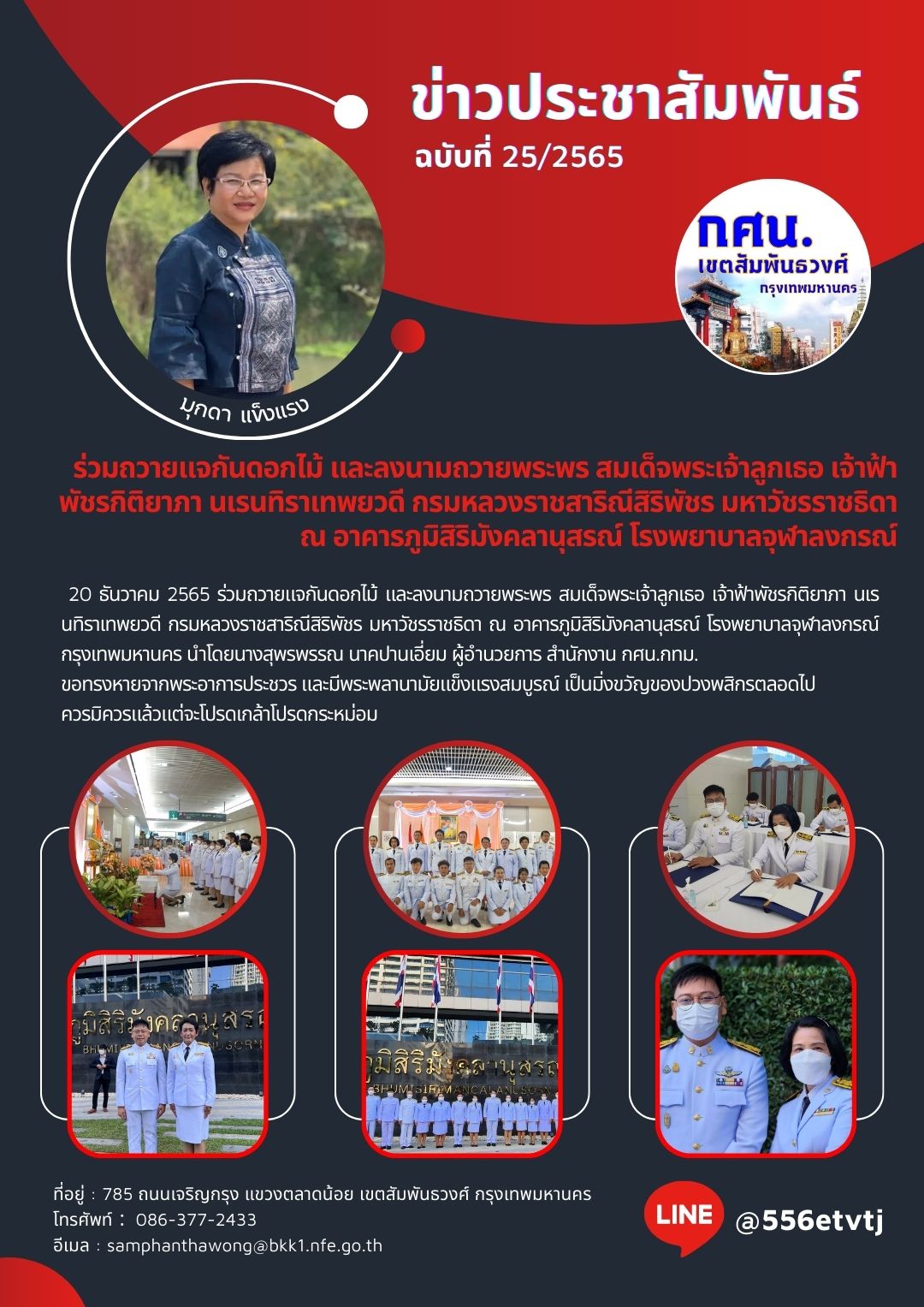 20 ธันวาคม 2565 กศน.เขตสัมพันธวงศ์ ร่วมถวายแจกันดอกไม้ และลงนามถวายพระพร สมเด็จพระเจ้าลูกเธอ เจ้าฟ้าพัชรกิติยาภา นเรนทิราเทพยวดี กรมหลวงราชสาริณีสิริพัชร มหาวัชรราชธิดา ณ