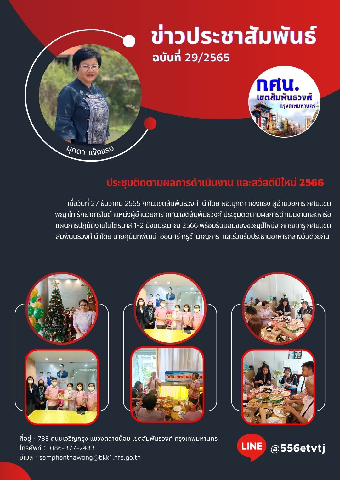 เมื่อวันที่ 27 ธันวาคม 2565 กศน.เขตสัมพันธวงศ์ นำโดย ผอ.มุกดา แข็งแรง ผู้อำนวยการ กศน.เขตพญาไท รักษาการในตำแหน่งผู้อำนวยการ กศน.เขตสัมพันธวงศ์ ประชุมติดตามผลการดำเนินงานและหารือแผนการปฏิบัติงานในไตรมาส 1-2 ปีงบประมาณ 2566 พร้อมรับมอบของขวัญปีใหม่จากคณะครู กศน.เขตสัมพันนธวงศ์ นำโดย นายศุนันทิพัฒน์ อ่อนศรี ครูชำนาญการ และร่วมรับประธานอาหารกลางวันด้วยกัน