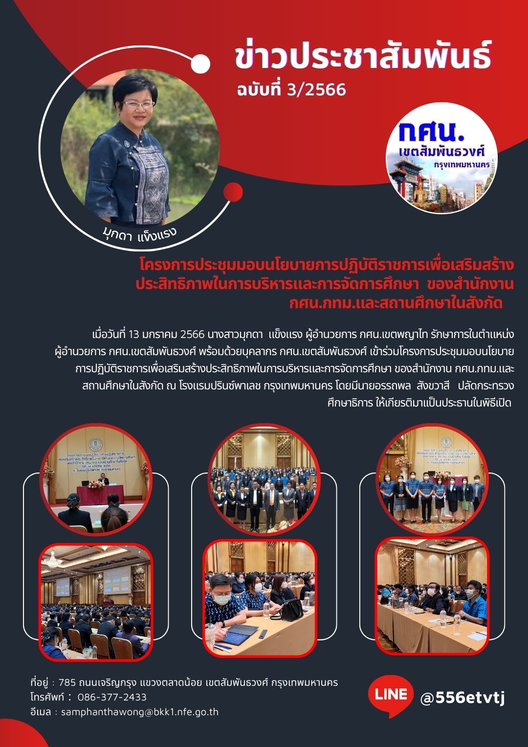 เมื่อวันที่ 13 มกราคม 2566 นางสาวมุกดา แข็งแรง ผู้อำนวยการ กศน.เขตพญาไท รักษาการในตำแหน่ง ผู้อำนวยการ กศน.เขตสัมพันธวงศ์ พร้อมด้วยบุคลากร กศน.เขตสัมพันธวงศ์ เข้าร่วมโครงการประชุมมอบนโยบายการปฏิบัติราชการเพื่อเสริมสร้างประสิทธิภาพในการบริหารและการจัดการศึกษา ของสำนักงาน กศน.กทม.และสถานศึกษาในสังกัด ณ โรงแรมปรินซ์พาเลช กรุงเทพมหานคร โดยมีนายอรรถพล สังขวาสี ปลัดกระทรวงศึกษาธิการ ให้เกียรติมาเเป็นประธานในพิธีเปิด