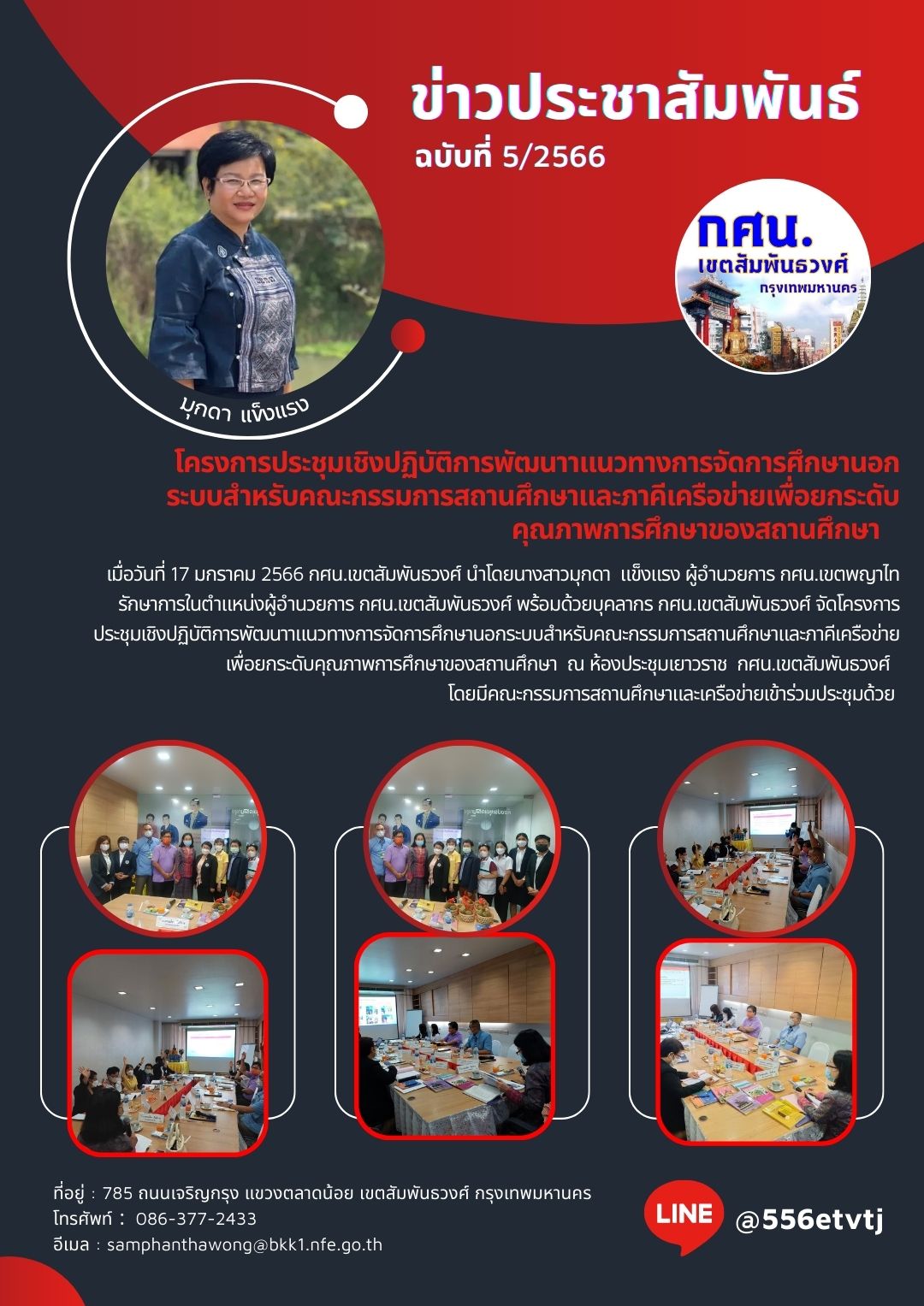 เมื่อวันที่ 17 มกราคม 2566 กศน.เขตสัมพันธวงศ์ นำโดยนางสาวมุกดา แข็งแรง ผู้อำนวยการ กศน.เขตพญาไทรักษาการในตำแหน่งผู้อำนวยการ กศน.เขตสัมพันธวงศ์ พร้อมด้วยบุคลากร กศน.เขตสัมพันธวงศ์ จัดโครงการประชุมเชิงปฏิบัติการพัฒนาาแนวทางการจัดการศึกษานอกระบบสำหรับคณะกรรมการสถานศึกษาและภาคีเครือข่ายเพื่อยกระดับคุณภาพการศึกษาของสถานศึกษา ณ ห้องประชุมเยาวราช กศน.เขตสัมพันธวงศ์ โดยมีคณะกรรมการสถานศึกษาและเครือข่ายเข้าร่วมประชุมด้วย