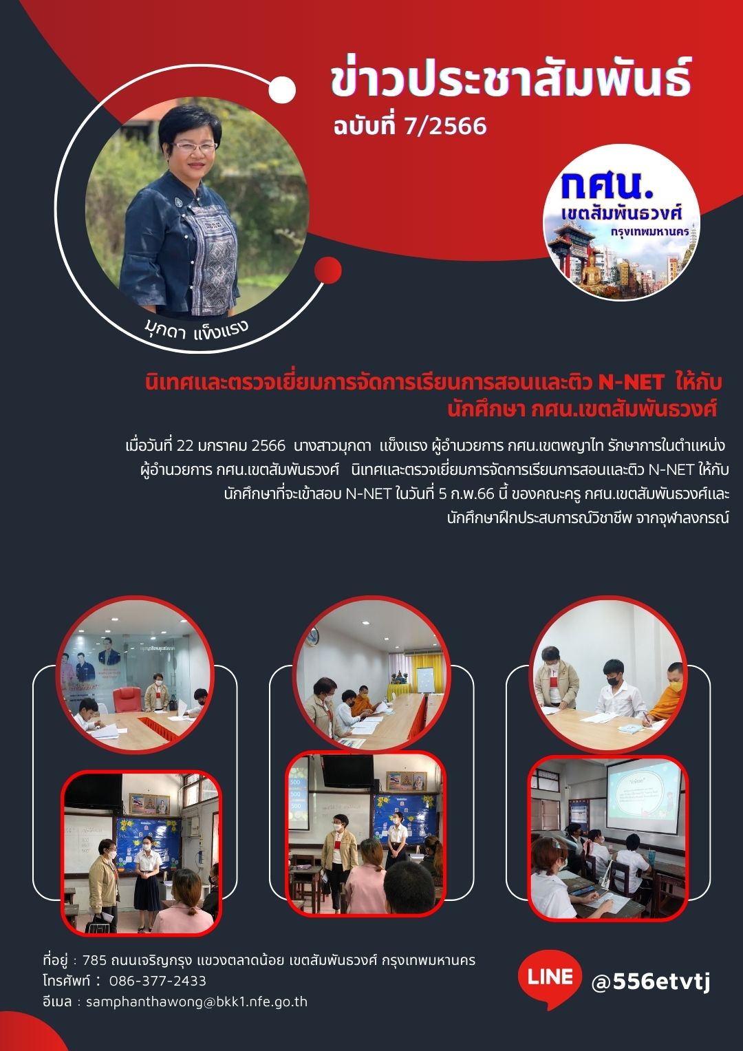 เมื่อวันที่ 22 มกราคม 2566 นางสาวมุกดา แข็งแรง ผู้อำนวยการ กศน.เขตพญาไท รักษาการในตำแหน่ง ผู้อำนวยการ กศน.เขตสัมพันธวงศ์ นิเทศและตรวจเยี่ยมการจัดการเรียนการสอนและติว N-NET ให้กับนักศึกษาที่จะเข้าสอบ N-NET ในวันที่ 5 ก.พ.66 นี้ ของคณะครู กศน.เขตสัมพันธวงศ์และ นักศึกษาฝึกประสบการณ์วิชาชีพ จากจุฬาลงกรณ์