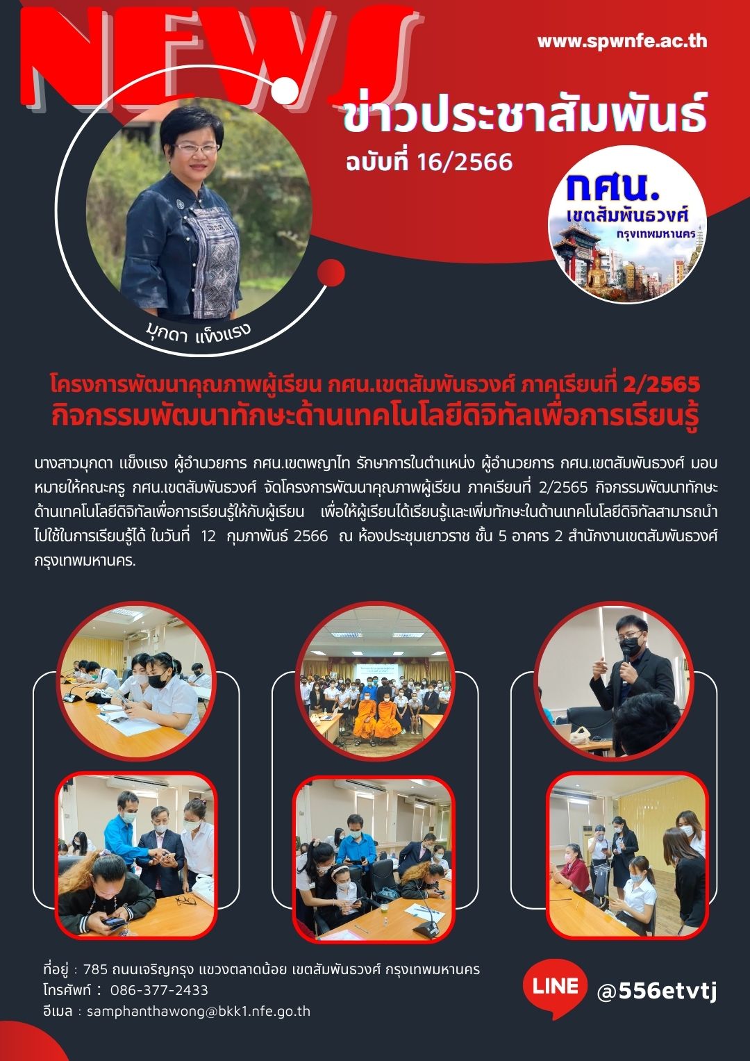 กศน.เขตสัมพันธวงศ์ โดยนางสาวมุกดา แข็งแรง ผู้อำนวยการ กศน.เขตพญาไท รักษาการในตำแหน่ง ผู้อำนวยการ กศน.เขตสัมพันธวงศ์ มอบหมายให้ กศน.เขตสัมพันธวงศ์ จัดโครงการพัฒนาคุณภาพผู้เรียน ภาคเรียนที่ 2/2565 กิจกรรมพัฒนาทักษะด้านเทคโนโลยีดิจิทัลเพื่อการเรียนรู้ให้กับผู้เรียน เพื่อให้ผู้เรียนได้เรียนรู้และเพิ่มทักษะในด้านเทคโนโลยีดิจิทัลสามารถนำไปใช้ในการเรียนรู้ได้ ในวันที่ 12 กุมภาพันธ์ 2566 ณ ห้องชุมเยาวราช ชั้น 5 อาคาร 2 สำนักงานเขตสัมพันธวงศ์ แขวงตลาดน้อย เขตสัมพันธวงศ์ กรุงเทพมหานคร