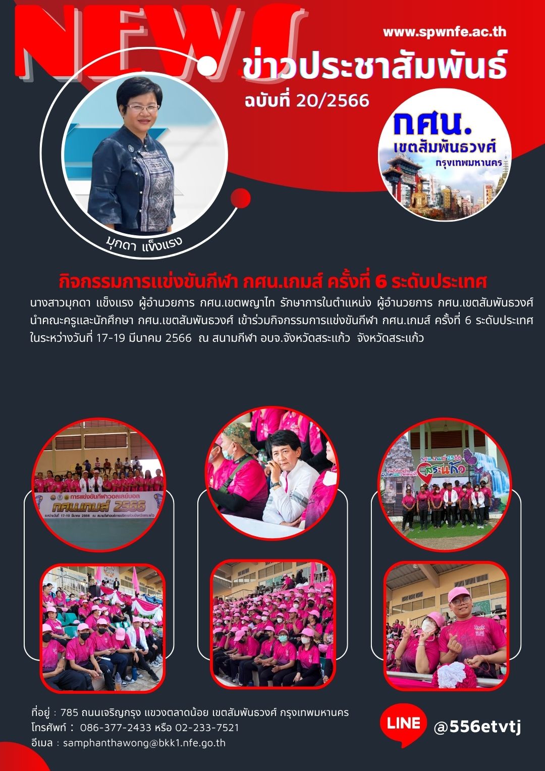 นางสาวมุกดา แข็งแรง ผู้อำนวยการ กศน.เขตพญาไท รักษาการในตำแหน่ง ผู้อำนวยการ กศน.เขตสัมพันธวงศ์ นำคณะครูและนักศึกษา กศน.เขตสัมพันธวงศ์ เข้าร่วมกิจกรรมการแข่งขันกีฬา กศน.เกมส์ ครั้งที่ 6 ระดับประเทศ ในระหว่างวันที่ 17-19 มีนาคม 2566 ณ สนามกีฬา อบจ.จังหวัดสระแก้ว จังหวัดสระแก้ว