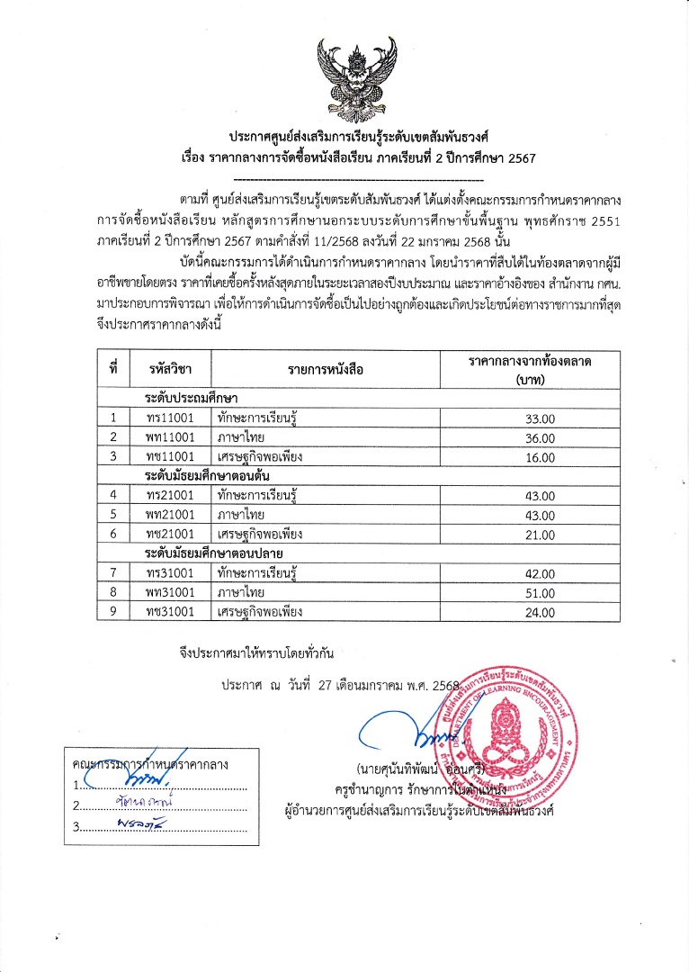 ประกาศราคากลางการจัดซื้อหนังสือเรียน ภาคเรียน 2 ปีการศึกษา 2567