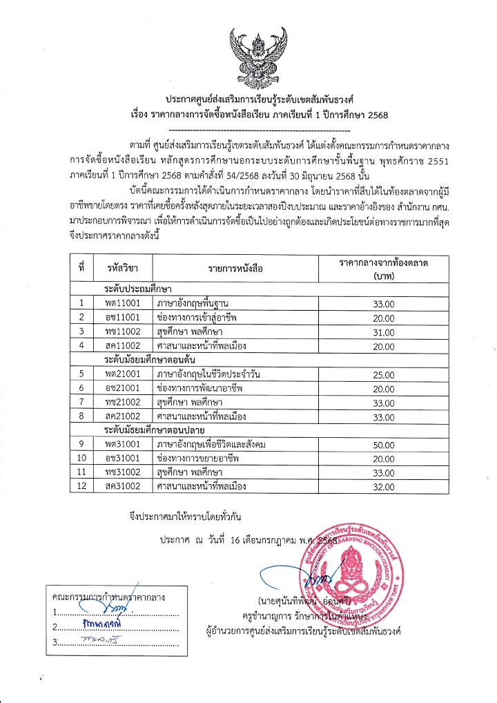 ประกาศราคากลางการจัดซื้อหนังสือเรียน ภาคเรียน 1 ปีการศึกษา 2568