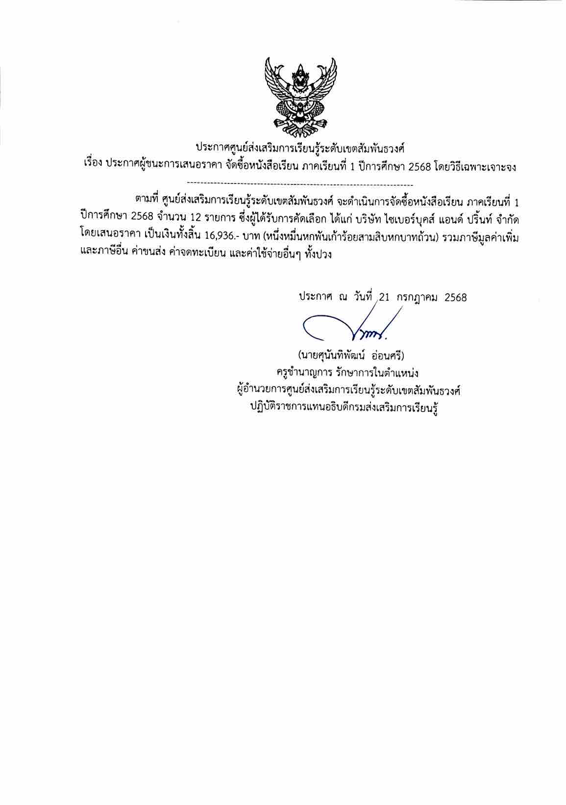 ประกาศผู้ชนะการเสนอราคาจัดซื้อหนังสือเรียน ภาคเรียนที่ 1 ปีการศึกษา 2568