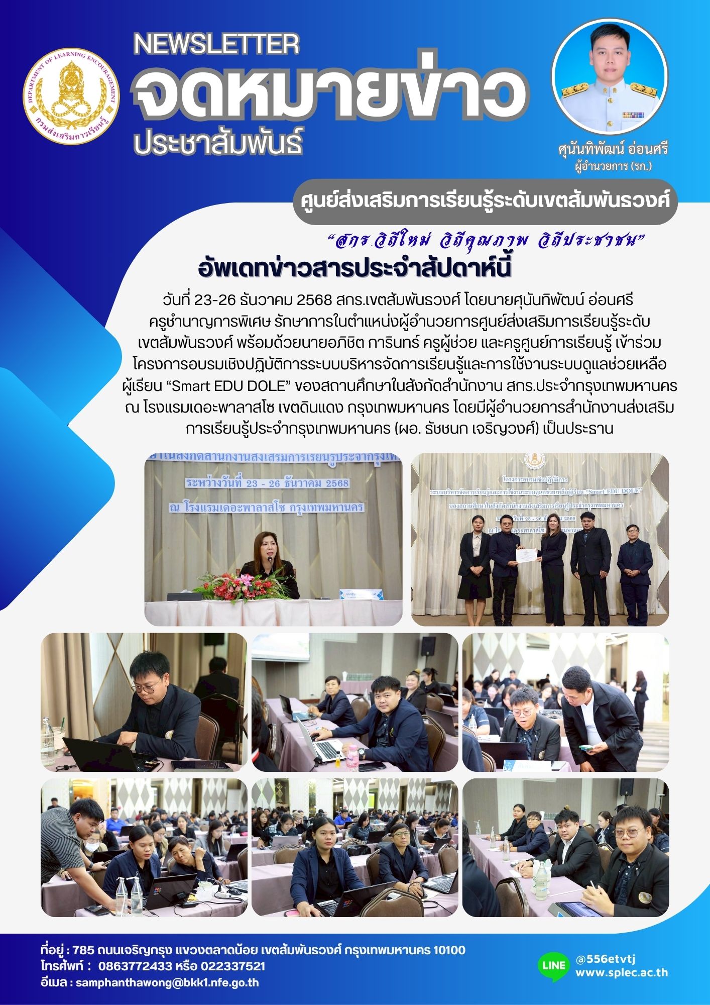 วันที่ 23-26 ธันวาคม 2568 สกร.เขตสัมพันธวงศ์ โดยนายศุนันทิพัฒน์ อ่อนศรี ครูชำนาญการพิเศษ รักษาการในตำแหน่งผู้อำนวยการศูนย์ส่งเสริมการเรียนรู้ระดับเขตสัมพันธวงศ์ พร้อมด้วยนายอภิชิต การินทร์ ครูผู้ช่วย และครูศูนย์การเรียนรู้ เข้าร่วมโครงการอบรมเชิงปฏิบัติการระบบบริหารจัดการเรียนรู้และการใช้งานระบบดูแลช่วยเหลือ ผู้เรียน “Smart EDU DOLE” ของสถานศึกษาในสังกัดสำนักงาน สกร.ประจำกรุงเทพมหานคร ณ โรงแรมเดอะพาลาสโซ เขตดินแดง กรุงเทพมหานคร โดยมีผู้อำนวยการสำนักงานส่งเสริมการเรียนรู้ประจำกรุงเทพมหานคร (ผอ. ธัชชนก เจริญวงศ์) เป็นประธาน