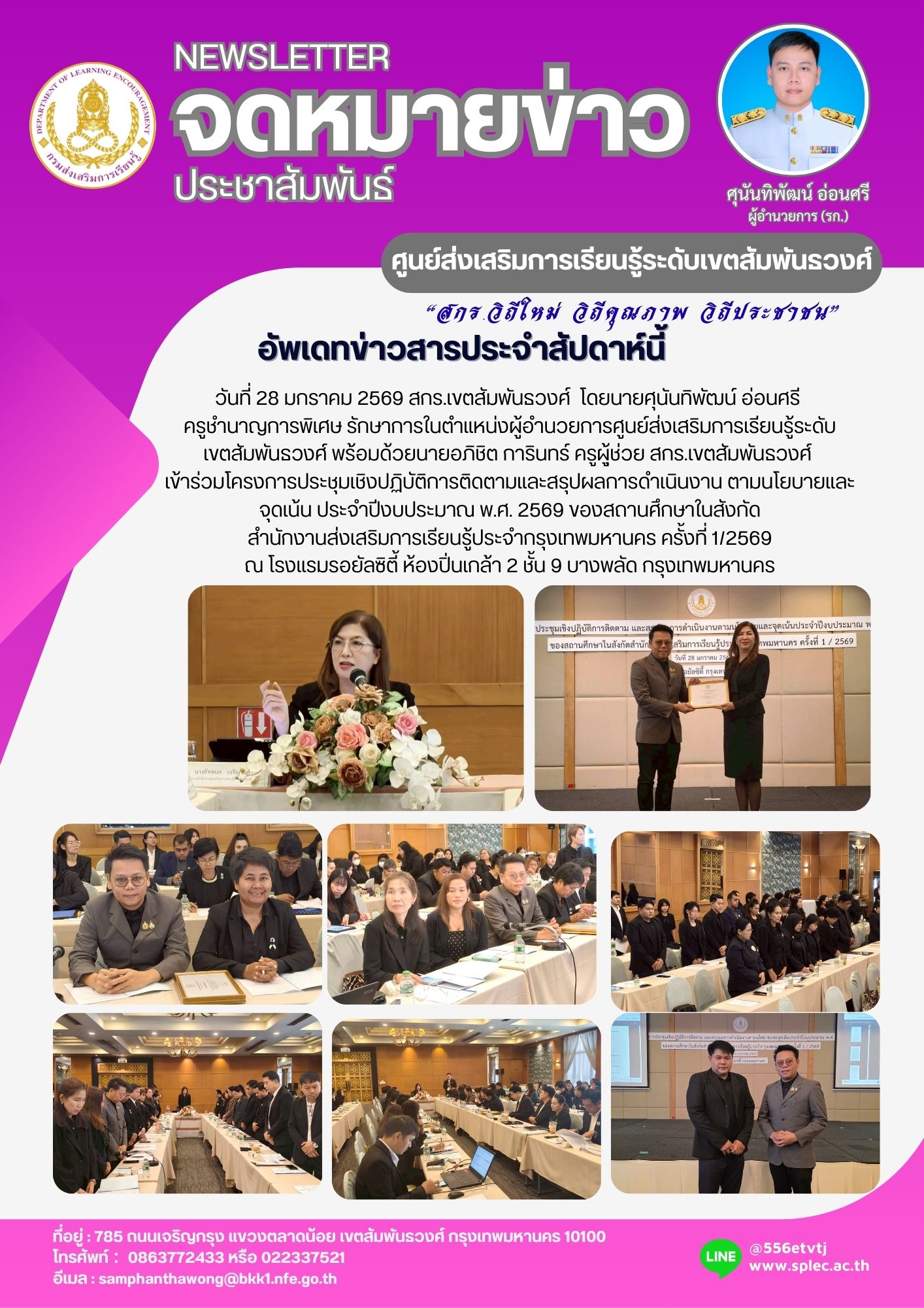 วันที่ 28 มกราคม 2569 สกร.เขตสัมพันธวงศ์ โดยนายศุนันทิพัฒน์ อ่อนศรี ครูชำนาญการพิเศษ รักษาการในตำแหน่งผู้อำนวยการศูนย์ส่งเสริมการเรียนรู้ระดับเขตสัมพันธวงศ์ พร้อมด้วยนายอภิชิต การินทร์ ครูผุู้ช่วย สกร.เขตสัมพันธวงศ์ เข้าร่วมโครงการประชุมเชิงปฏิบัติการติดตามและสรุปผลการดำเนินงาน ตามนโยบายและจุดเน้น ประจำปีงบประมาณ พ.ศ. 2569 ของสถานศึกษาในสังกัดสำนักงานส่งเสริมการเรียนรู้ประจำกรุงเทพมหานคร ครั้งที่ 1/2569 ณ โรงแรมรอยัลซิตี้ ห้องปิ่นเกล้า 2 ชั้น 9 บางพลัด กรุงเทพมหานคร