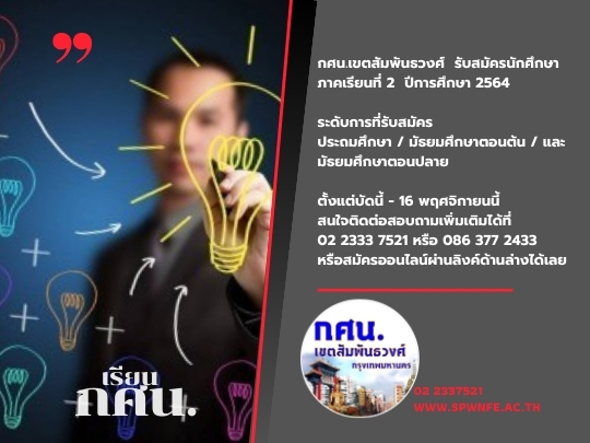 กศน.เขตสัมพันธวงศ์ เปิดรับสมัครนักศึกษาใหม่ ภาคเรียนที่ 2 ปีการศึกษา 2564 ระดับประถมศึกษา มัธยมศึกษาตอนต้น และมัธยมศึกษาตอนปลาย ตั้งแต่บัดนี้ - 16 พฤศจิกายน 2564 สมัครเรียนออนไลน์ได้ที่ https://