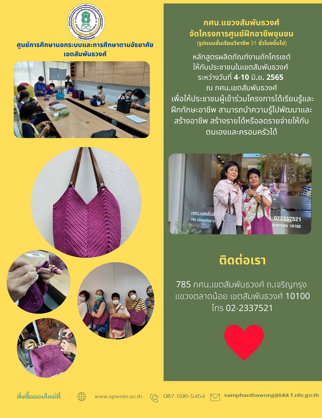 วันที่ 4-10 มิถุนายน 2565 กศน.เขตสัมพันธวงศื โดย กศน.แขวงสัมพันธวงศ์ ดำเนินโครงการศูนย์ฝึกอาชีพชุมชน หลักสุตรผลิตภัณฑ์งานถักโครเชต์ ณ ห้องประชุมเจริญกรุง ชั้น 4 กศน.เขตสัมพันธวงศ์ เพื่อให้ประชาชนได้เรียนรู้ และฝึกทักษะอาชีพ สามารถนำความรู้ไปพัฒนาฝีมือ และสร้างรายได้ หรือลดรายจ่ายให้กับตนเองบและครอบครัวได้