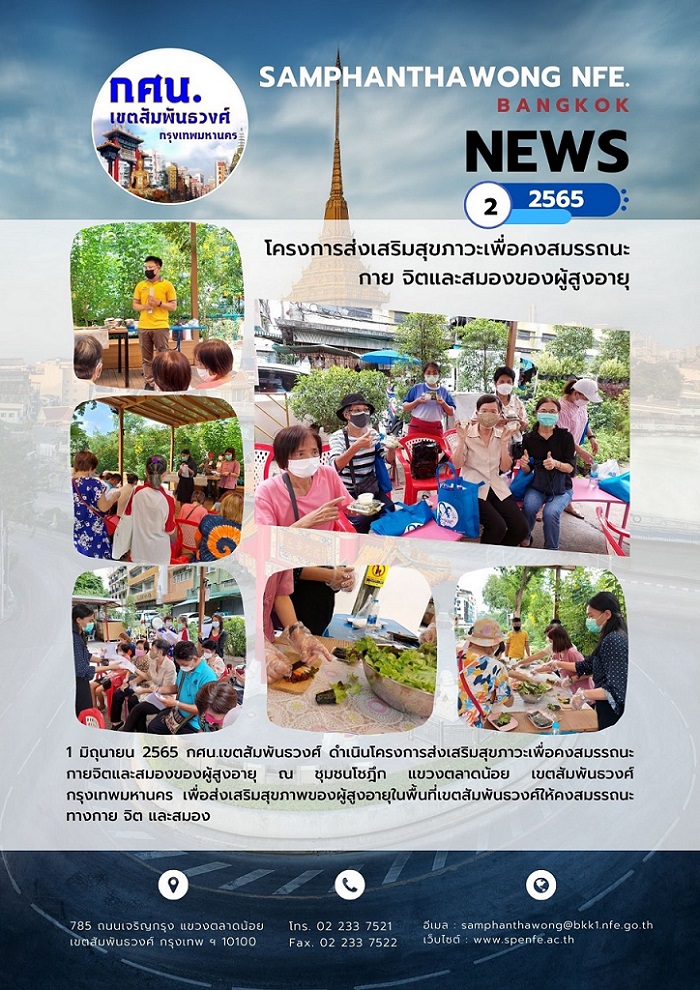 1 มิถุนายน 2565 กศน.เขตสัมพันธวงศ์ ดำเนินโครงการส่งเสริมสุขภาวะเพื่อคงสมรรถนะกายจิตและสมองของผู้สูงอายุ ณ ชุมชนโชฎึก แขวงตลาดน้อย เขตสัมพันธวงศ์ กรุงเทพมหานคร เพื่อส่งเสริมสุขภาพของผู้สูงอายุในพื้นที่เขตสัมพันธวงศ์ให้คงสมรรถนะทางกาย จิต และสมอง