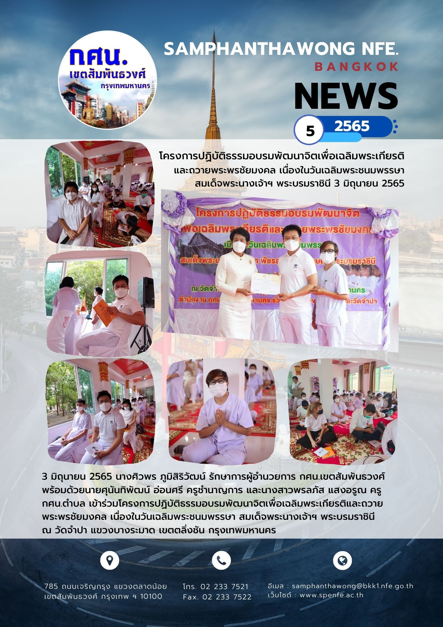 3 มิถุนายน 2565 นางศิวพร ภูมิสิริวัฒน์ รักษาการผู้อำนวยการ กศน.เขตสัมพันธวงศ์ พร้อมด้วยนายศุนันทิพัฒน์ อ่อนศรี ครูชำนาญการ และนางสาวพรลภัส แสงอรูณ ครู กศน.ตำบล เข้าร่วมโครงการปฏิบัติธรรมอบรมพัฒนาจิตเพื่อเฉลิมพระเกียรติและถวายพระพรชัยมงคล เนื่องในวันเฉลิมพระชนมพรรษา สมเด็จพระนางเจ้าฯ พระบรมราชินี