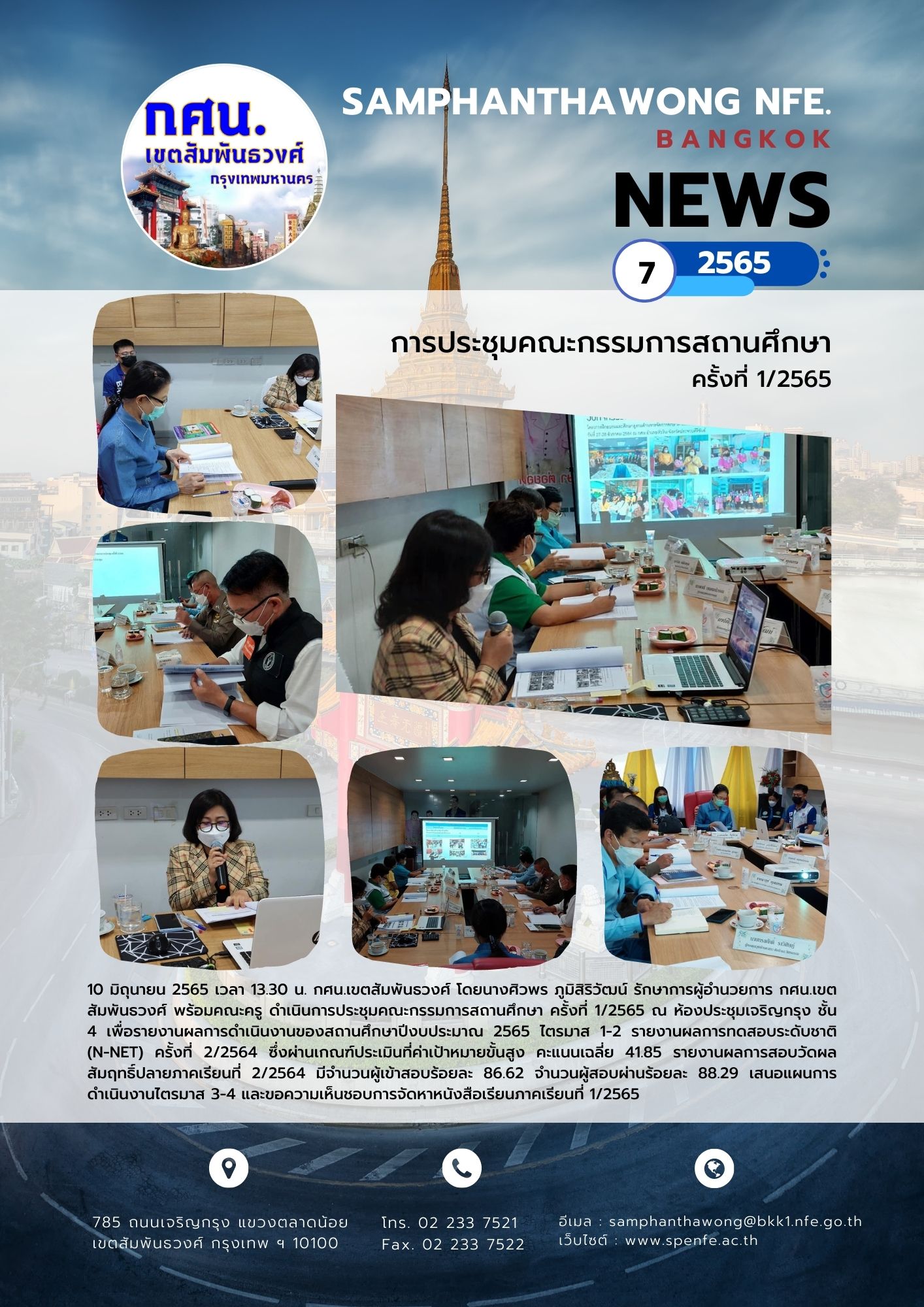 10 มิถุนายน 2565 เวลา 13.30 น. กศน.เขตสัมพันธวงศ์ โดยนางศิวพร ภูมิสิริวัฒน์ รักษาการผู้อำนวยการ กศน.เขตสัมพันธวงศ์ พร้อมคณะครู ดำเนินการประชุมคณะกรรมการสถานศึกษา ครั้งที่ 1/2565 ณ ห้องประชุมเจริญกรุง ชั้น 4 เพื่อรายงานผลการดำเนินงานของสถานศึกษาปีงบประมาณ 2565 ไตรมาส 1-2 รายงานผลการทดสอบระดับชาติ (N-NET) ครั้งที่ 2/2564 ซึ่งผ่านเกณฑ์ประเมินที่ค่าเป้าหมายขั้นสูง คะแนนเฉลี่ย 41.85 รายงานผลการสอบวัดผลสัมฤทธิ์ปลายภาคเรียนที่ 2/2564 มีจำนวนผู้เข้าสอบร้อยละ 86.62 จำนวนผู้สอบผ่านร้อยละ 88.29 เสนอแผนการดำเนินงานไตรมาส 3-4 และขอความเห็นชอบการจัดหาหนังสือเรียนภาคเรียนที่ 1/2565