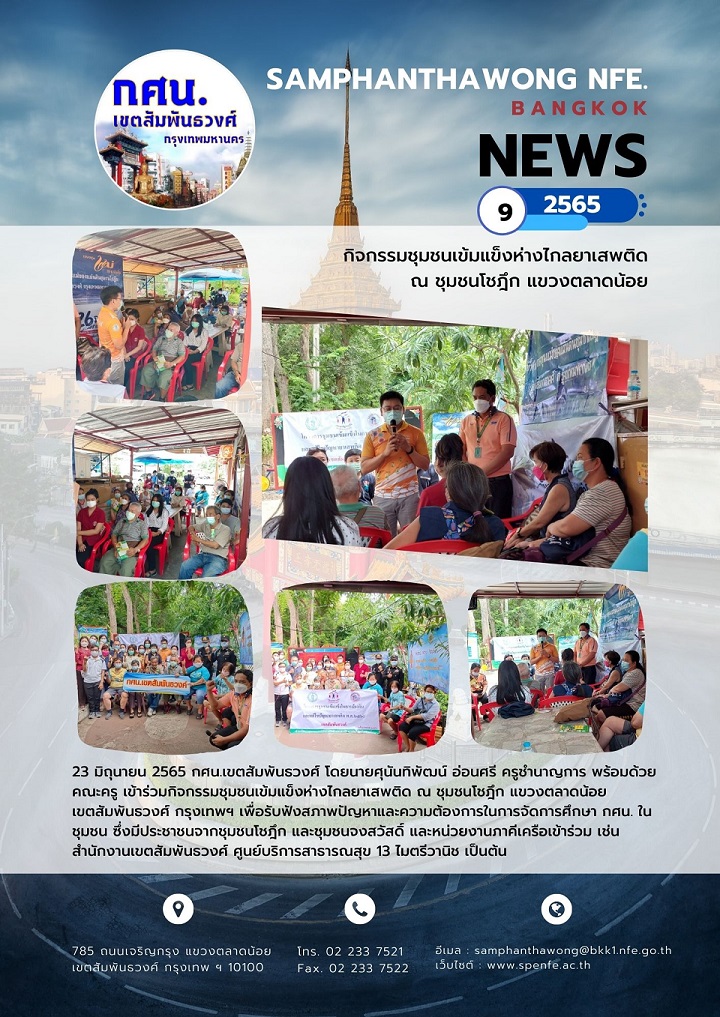 23 มิถุนายน 2565 กศน.เขตสัมพันธวงศ์ โดยนายศุนันทิพัฒน์ อ่อนศรี ครูชำนาญการ พร้อมด้วยคณะครู เข้าร่วมกิจกรรมชุมชนเข้มแข็งห่างไกลยาเสพติด ณ ชุมชนโชฎึก แขวงตลาดน้อย