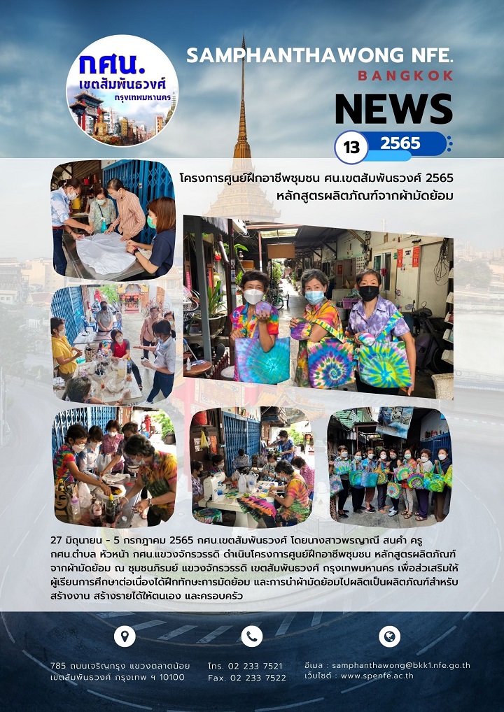 27 มิถุนายน - 5 กรกฎาคม 2565 กศน.เขตสัมพันธวงศ์ โดยนางสาวพรญาณี สนคำ ครู กศน.ตำบล หัวหน้า กศน.แขวงจักรวรรดิ ดำเนินโครงการศูนย์ฝึกอาชีพชุมชน หลักสูตรผลิตภัณฑ์จากผ้ามัดย้อม ณ ชุมชนภิรมย์ แขวงจักรวรรดิ เขตสัมพันธวงศ์ กรุงเทพมหานคร เพื่อส่วเสริมให้ ผู้เรียนการศึกษาต่อเนื่องได้ฝึกทักษะการมัดย้อม และการนำผ้ามัดย้อมไปผลิตเป็นผลิตภัณฑ์สำหรับสร้างงาน สร้างรายได้ให้ตนเอง และครอบครัว